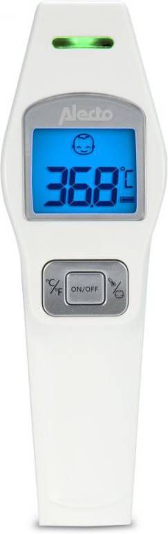Alecto Infrarood VoorhoofdthermometerDeze Infrarood voorhoofdthermometer van Alecto werkt gemakkelijk en snel. Plaats de thermometer tegen het voorhoofd en wacht 3 seconde tot het resultaat zichtbaar is. Wanneer het blijkt dat je kindje koorts heeft geeft de thermometer dit aan met een geluidje en een rood lampje. Geen gedoe meer met luier uit, stil liggen, huilende kinderen. De thermometer heeft een automatische opslag van de laatste 20 gemeten waarden. Tip: bij twijfel over het juist opmeten, neem altijd contact op met de huisarts.